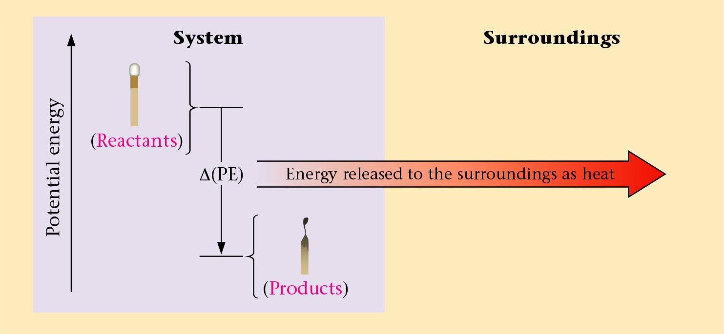 - Exothermic change - heat released to the surroundings (q = -)