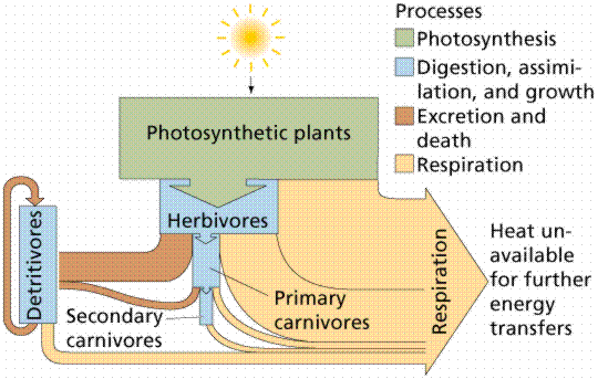 - Moves from autotrophs to heterotrophs & eventually to decomposers