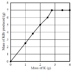 A student performs a laboratory experiment in which potassium bromide (KBr) was produced from a reaction involving solid potassium and a limiting amount of liquid bromine. The graph below shows the amount of potassium bromide produced for varying amounts of potassium supplied for the reaction.